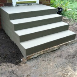 Poured concrete steps provide a sturdy, long-lasting transition between an outdoor surface, such as a patio, and the entry to your house.